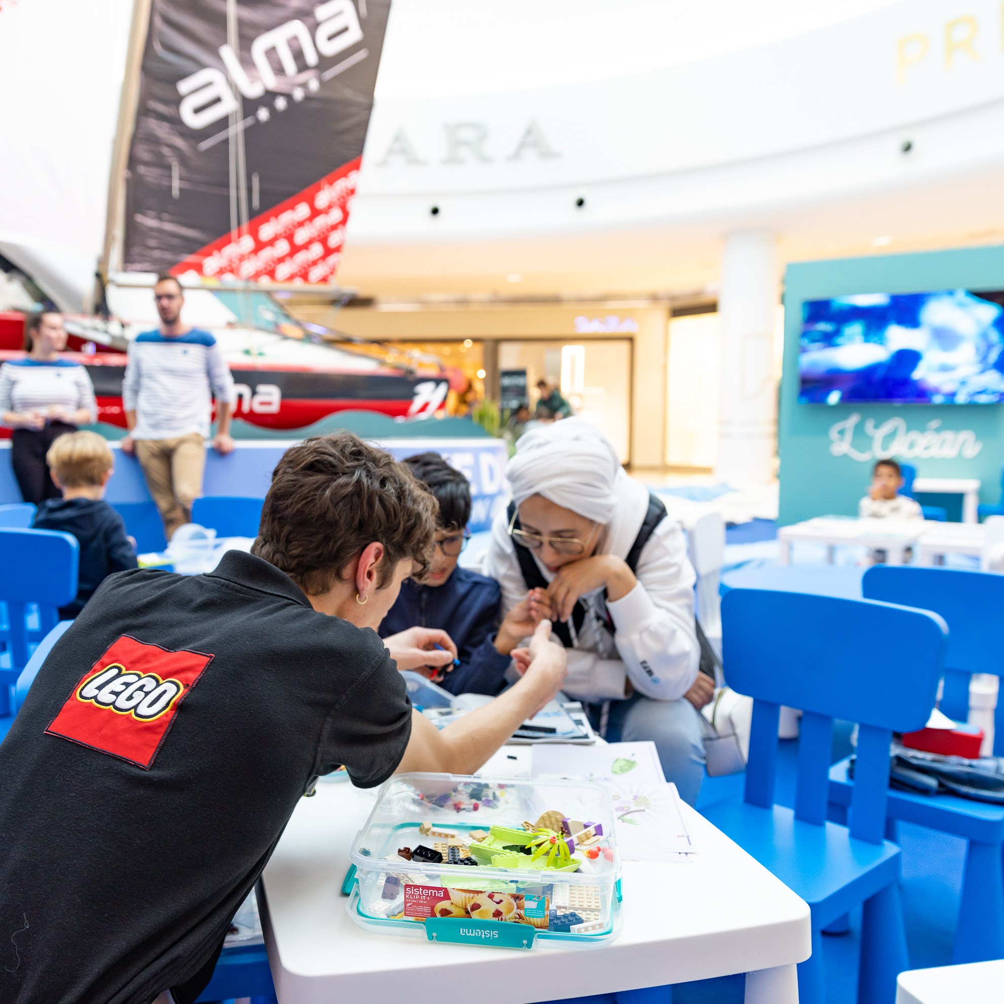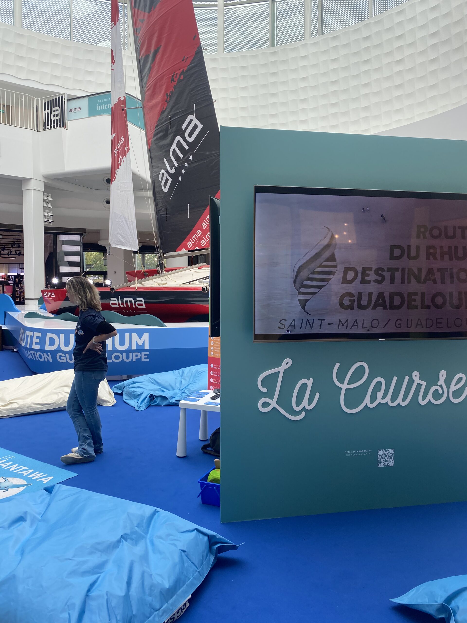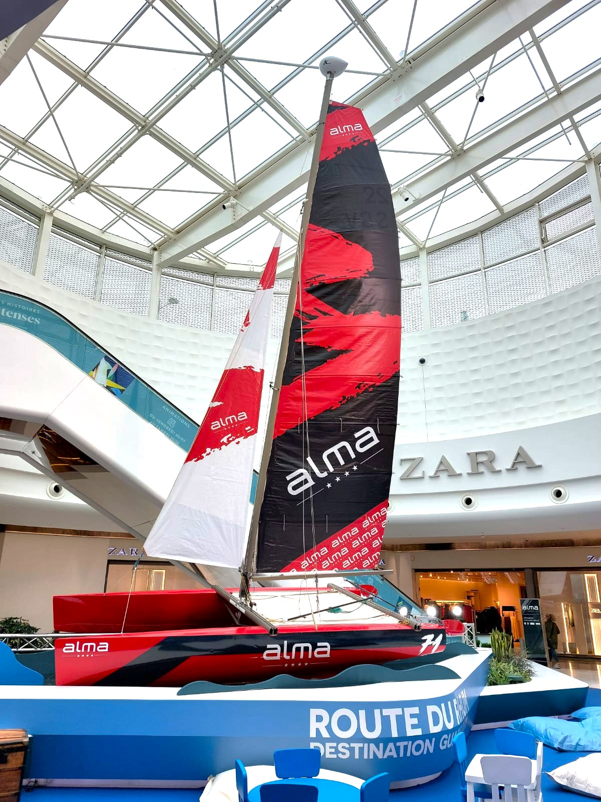 Créer une scénographie spectaculaire au cœur d’un centre commercial en activité, capable de recréer l’univers immersif et maritime de la Route du Rhum. Concevoir une installation technique ambitieuse — un catamaran suspendu de 10 m — tout en garantissant sécurité, visibilité et fluidité du parcours visiteurs. Allier impact visuel et démarche pédagogique : transformer un lieu de consommation en espace de sensibilisation aux enjeux environnementaux et à la protection des océans.